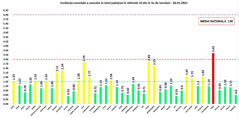 Timiș - singurul județ în scenariul roșu, cu 3,42 la mie