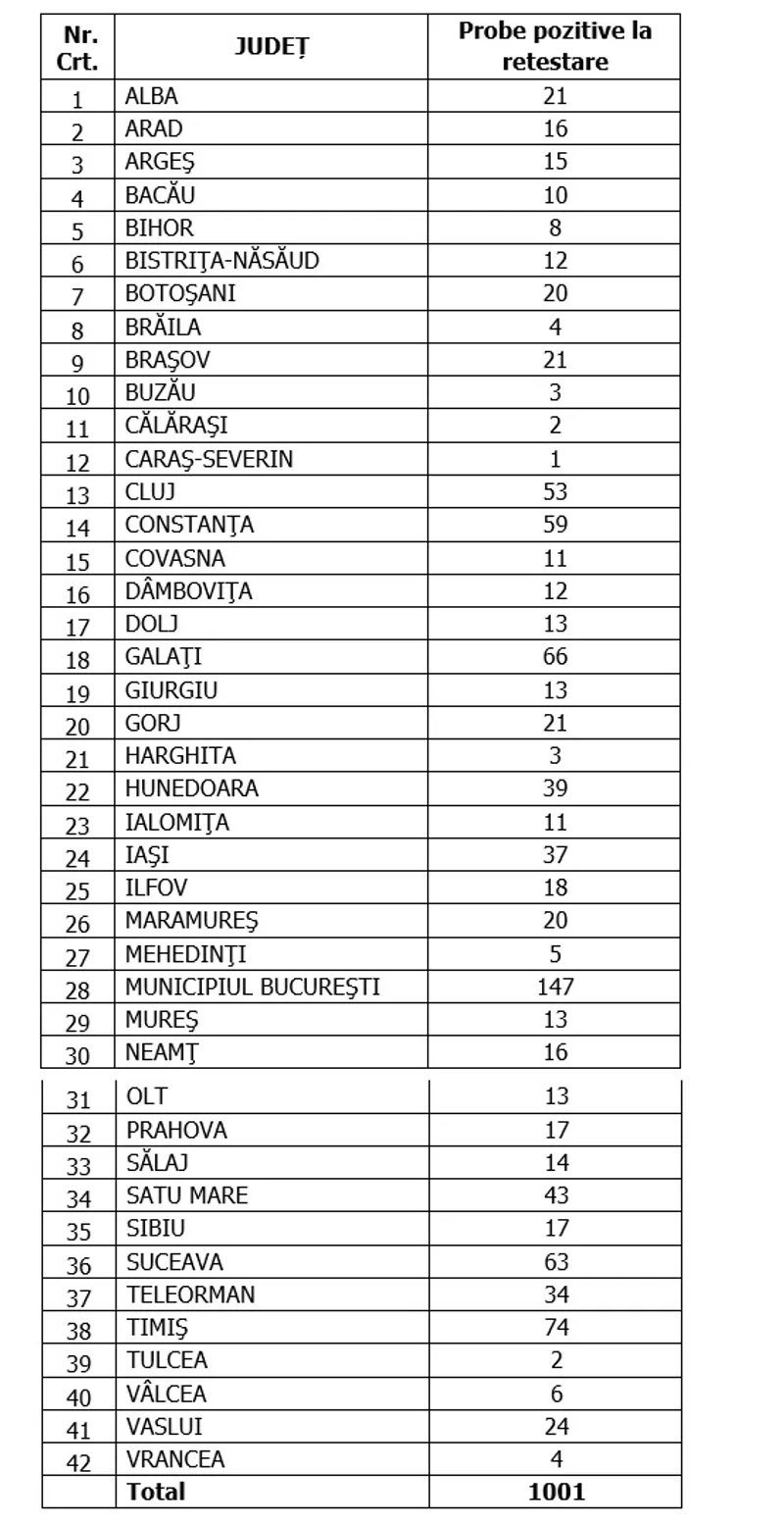 Distinct de cazurile nou confirmate, în urma retestării pacienților care erau deja pozitivi, 1.001 persoane au fost reconfirmate pozitiv.