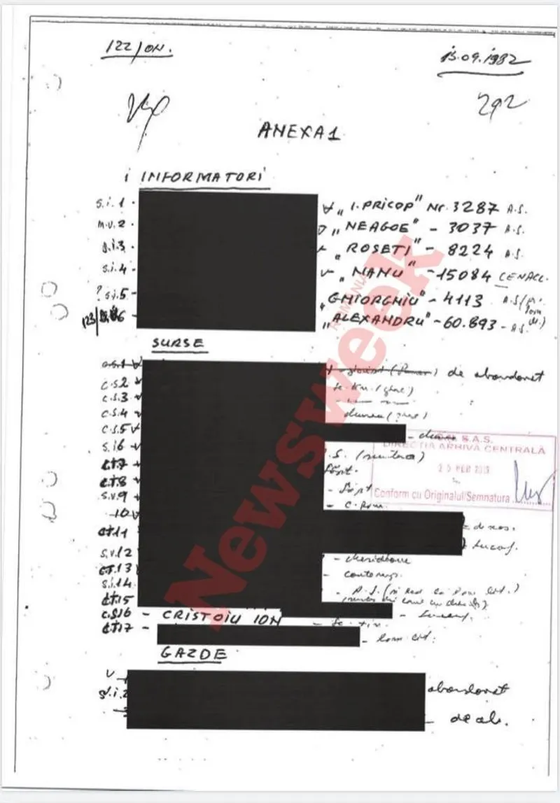În antet apare mențiunea „122/ ON”. Sunt inițialele lui Oprișor Onițiu, fost ofițer la Securitatea Municipiului București, care se ocupa de domeniul „Artă-Cultură”. La capitolul „Sursa”, apare numele Ion Cristoiu, cu mențiunea „Sc. Tin” (prescurtare a titlului „Scînteia Tineretului”, ziarul editat de UTC, la care acesta a lucrat în perioada comunistă).