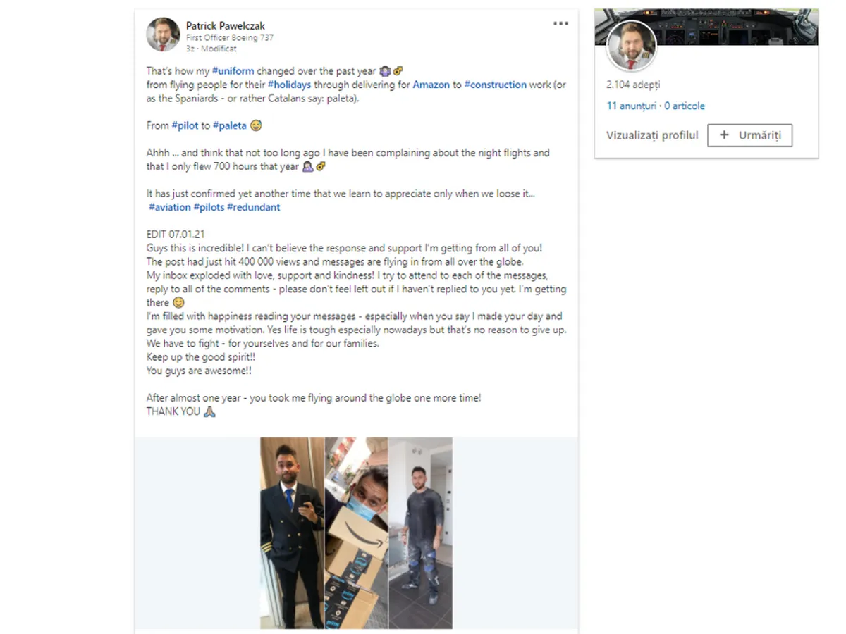 Patrick Pawelczak, un pilot de Boeing 737 care nu cu mult timp în urmă se plângea de programul aglomerat și zborurile de noapte către diverse destinații de vacanță, a povestit pe Linkedin cum, din cauza pandemiei, în doar câteva luni a fost nevoit să facă livrări pentru Amazon și, mai nou, să lucreze în construcții, ca zugrav, ca „paleta”, cum spun catalanii, pentru a câștiga ceva bani.
