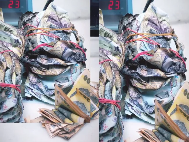 "Bancnotele din imagine au fost păstrate, cu scopul economisirii, în sobă 🔥! Posesorii le-au adus la sediul uneia dintre sucursalele BNR pentru a fi schimbate. Întrucât în urma verificării bancnotele îndeplineau criteriile pe care vi le-am detaliat într-un videoclip anterior, si anume: