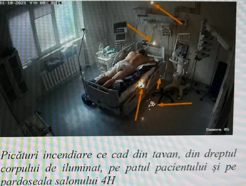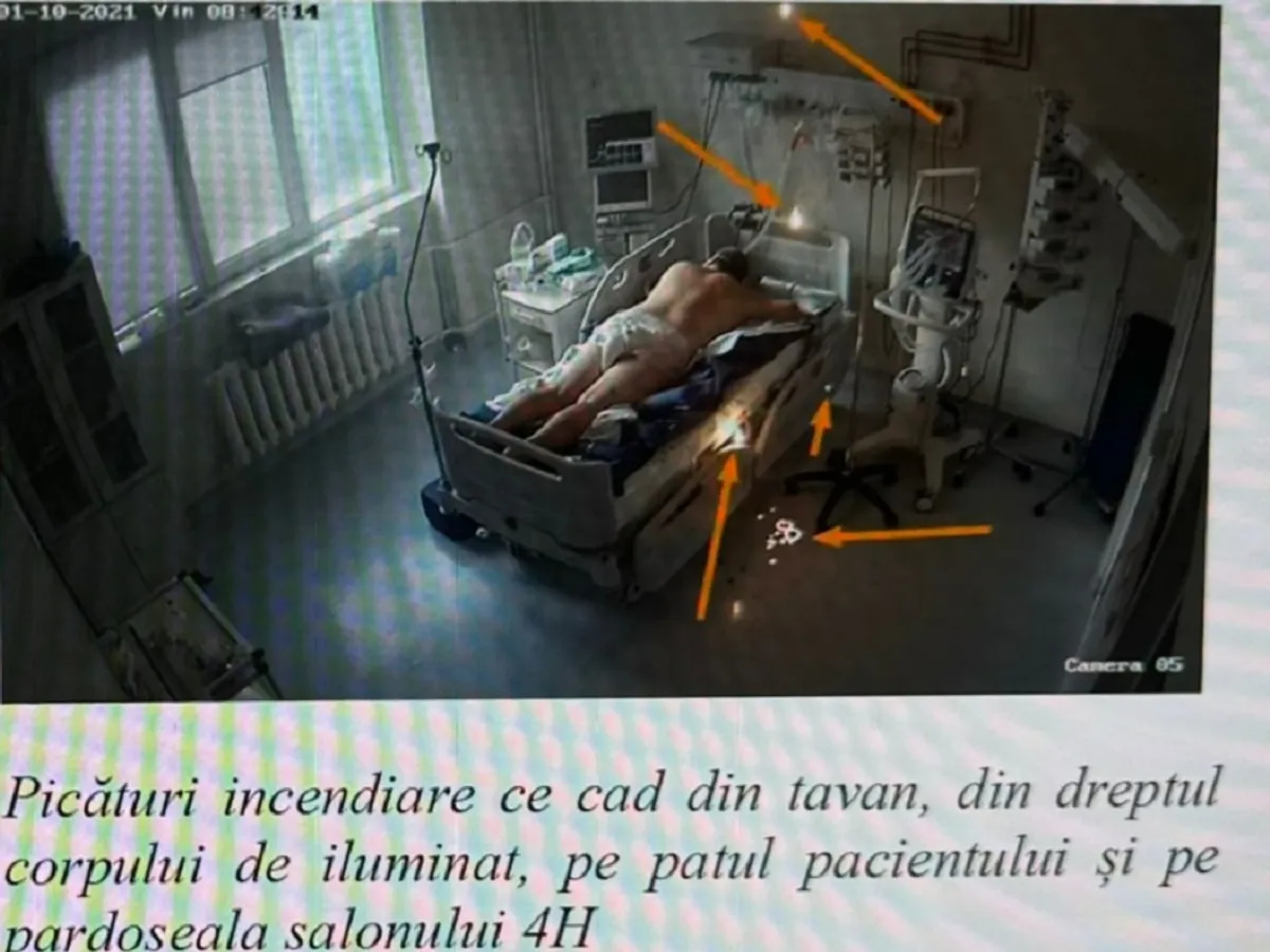 Foto: document NSEMEX- se observă cum ”picături incediare cad din tavan din dreptul corpului de iluminat pe patul pacientului și pe pardoseala salonului”.
