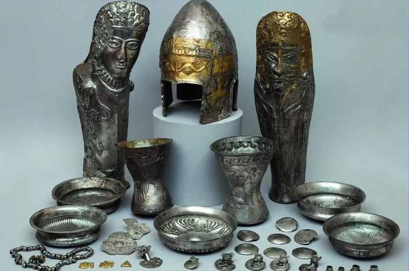 Printre piesele descoperite, din argint şi aur, s-au remarcat coiful, două cnemide (apărătoare de picior), două pocale, cinci phiale (vase plate gen cupe-străchini), dintre care una cu inscripţie, conform aceleiași surse.