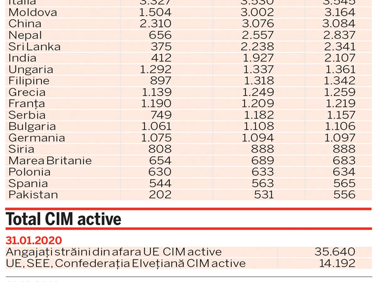Newsweek România a întocmit un top 20 al celor mai numeroși muncitori străini de la noi, care cuprinde și evoluția numărului acestora din 2018 până în ianuarie 2020 (tabel).