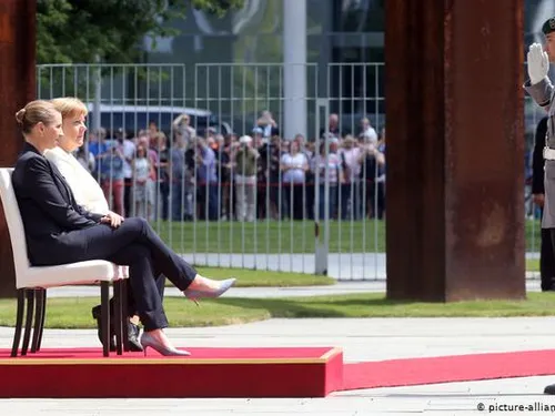 Noua premieră daneză a fost întâmpinată joi la Berlin cu onoruri militare, iar cancelara Merkel şi oaspetele ei s-au aşezat pur şi simplu pe scaune. Liniştită şi fără să tremure, Merkel a ascultat intonarea celor două imnuri.