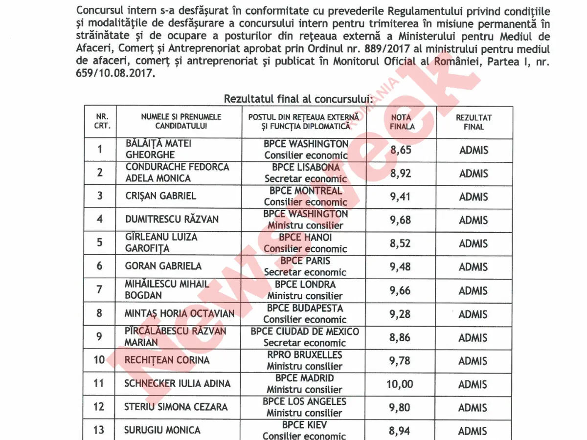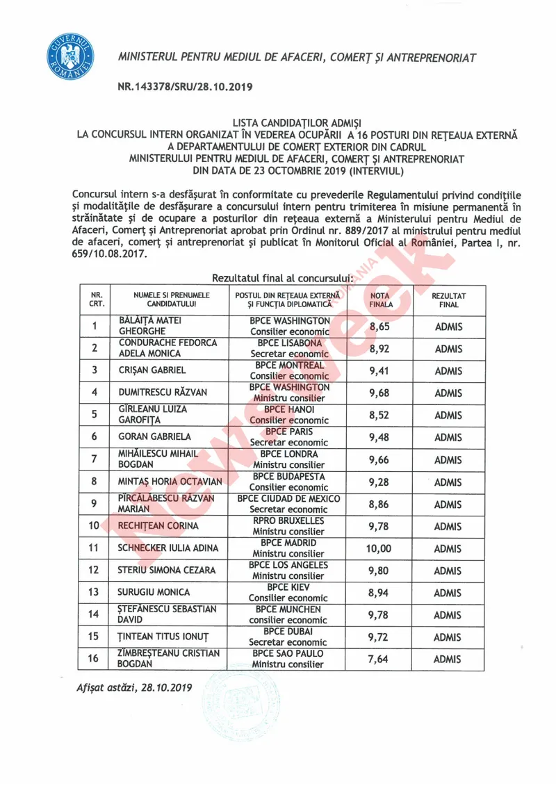 Pe ultima sută de metri a guvernului Dăncilă, MMACA, condus de ministrul demis Ștefan-Radu Oprea, a trimis sau reconfirmat în funcţii 16 consilieri economici în ambasadele României din întreaga lume, în urma unui simplu interviu. Rezultatele au fost publicate pe 28 octombrie, iar lista câștigătorilor ridică mari semne de întrebare, potrivit România Liberă.