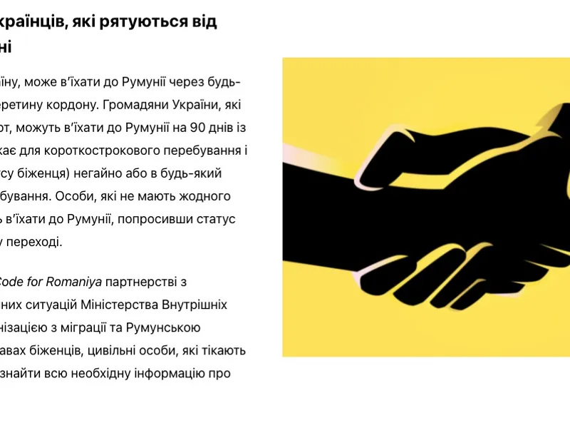 CODE 4 Romania, dintre cele mai puternice organizaţii de tehnologie civică din lume, a lansat https://dopomoha.ro/uk, o platformă IT în patru limbi (ucraineană română, engleză şi rusă) care conţine pe scurt informaţii pentru cei care intră în ţară, cum pot cere azil sau de ce documente au nevoie, cum funcţionează transportul public, care sunt drepturile pe care le au odată cu intrarea în România şi cum se pot evita să fie victimele traficului de fiinţe umane.