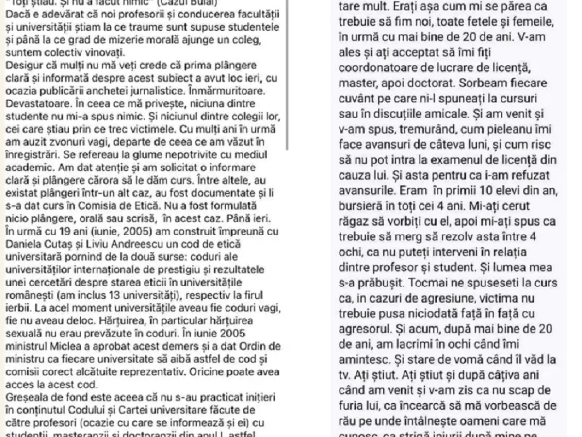 Acum câteva zile, când a izbucnit scandalul, Mihaela Miroiu a reacționat și a postat pe Facebook un mesaj în care susținea că nu era la curent cu traumele prin care treceau studentele. Însă, o fostă studentă i-a adus aminte că îi povestise acest lucru.