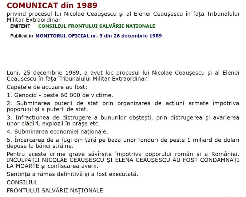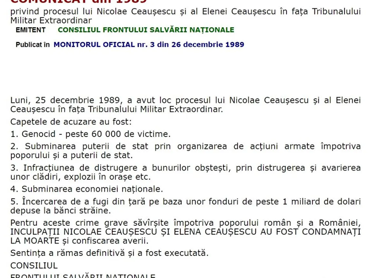 Cum suna comunicatul FSN care anunța moartea cuplului Ceaușescu