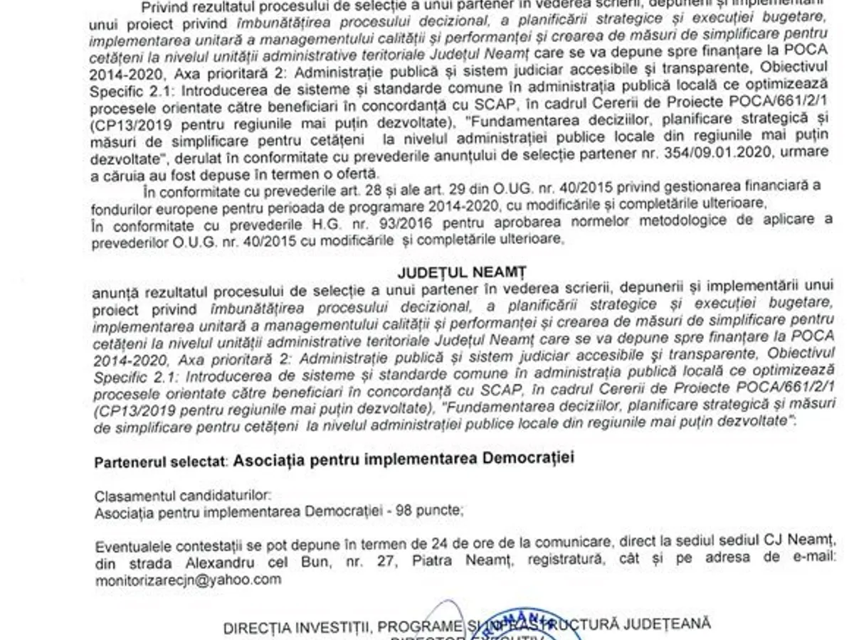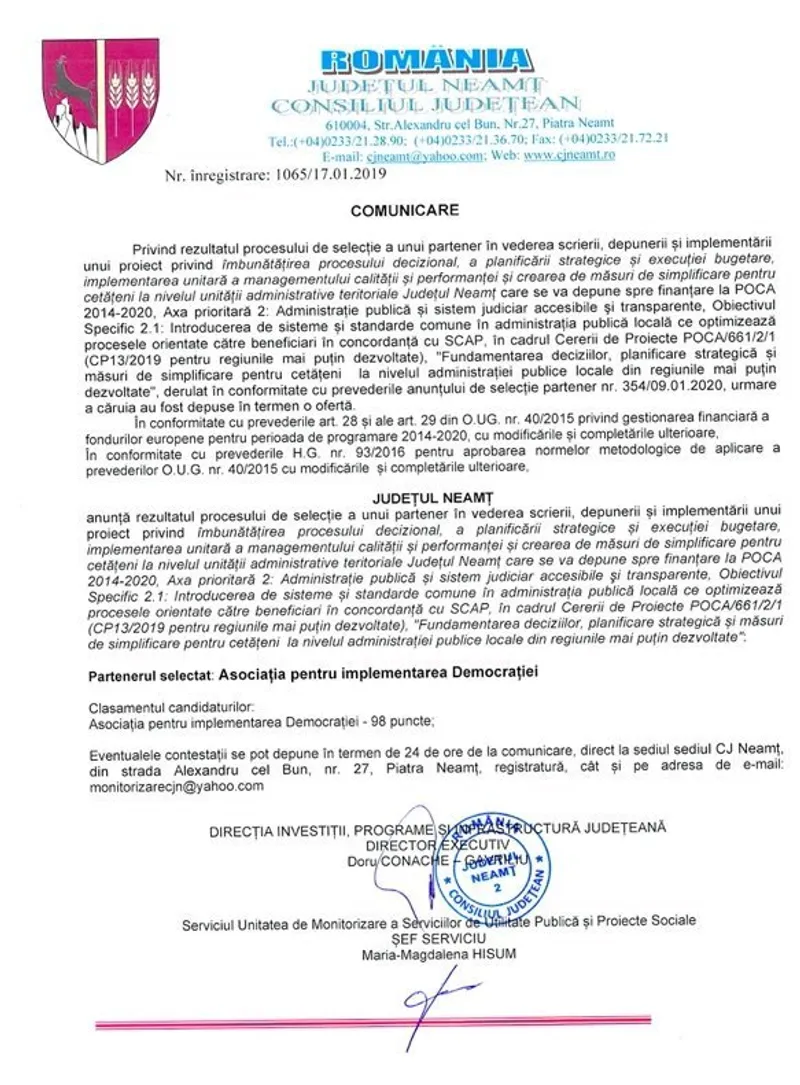 CJ Neamț a inițiat, pe 9 ianuarie, un proces de selecție a unui partener pentru realizarea proiectului european, iar opt zile mai târziu a fost anunțat și partenerul: Asociația pentru implementarea Democrației. AID a fost singurul ONG care s-a înscris în competiție.