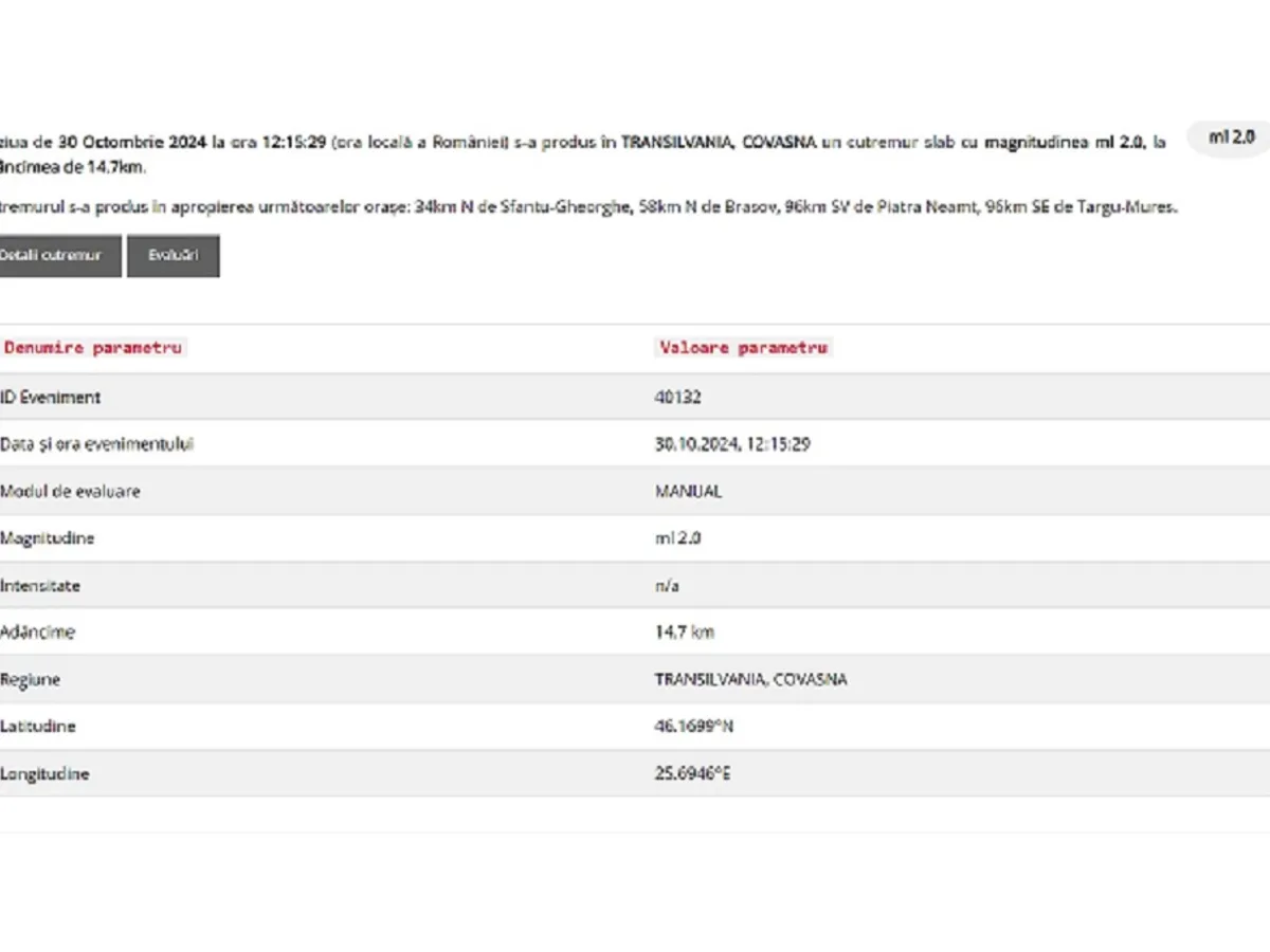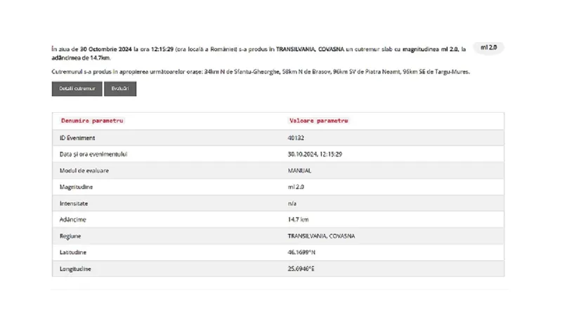 Conform institutului Național de Fizica Pământului, seismul s-a produs la ora 12:15, în Transilvania, Covasna.