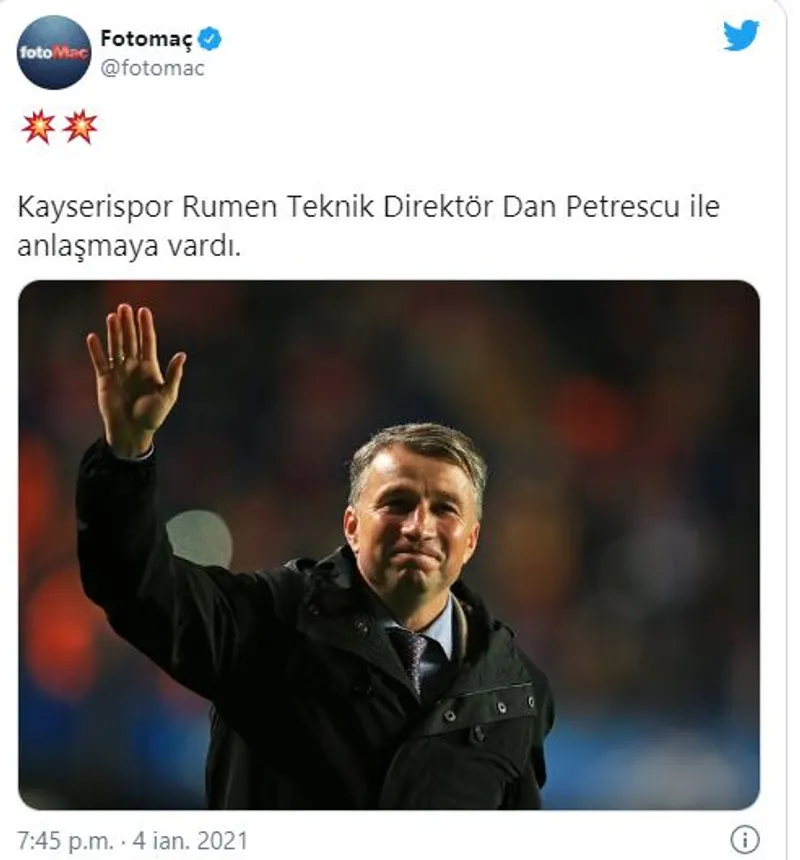 Antrenorul Dan Petrescu ar fi ajuns la un acord cu Kayserispor pentru preluarea echipei la care sunt legitimaţi Cristian Săpunaru, Silviu Lung Jr. şi Denis Alibec, scrie, luni, pe Twitter, cotidianul Fotomac.