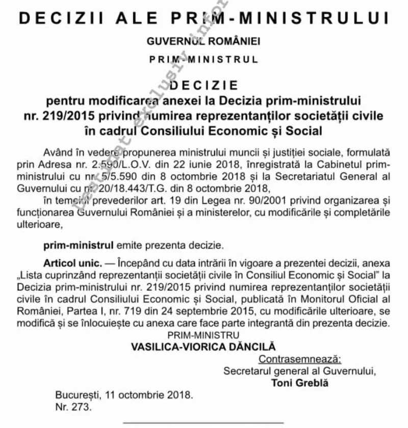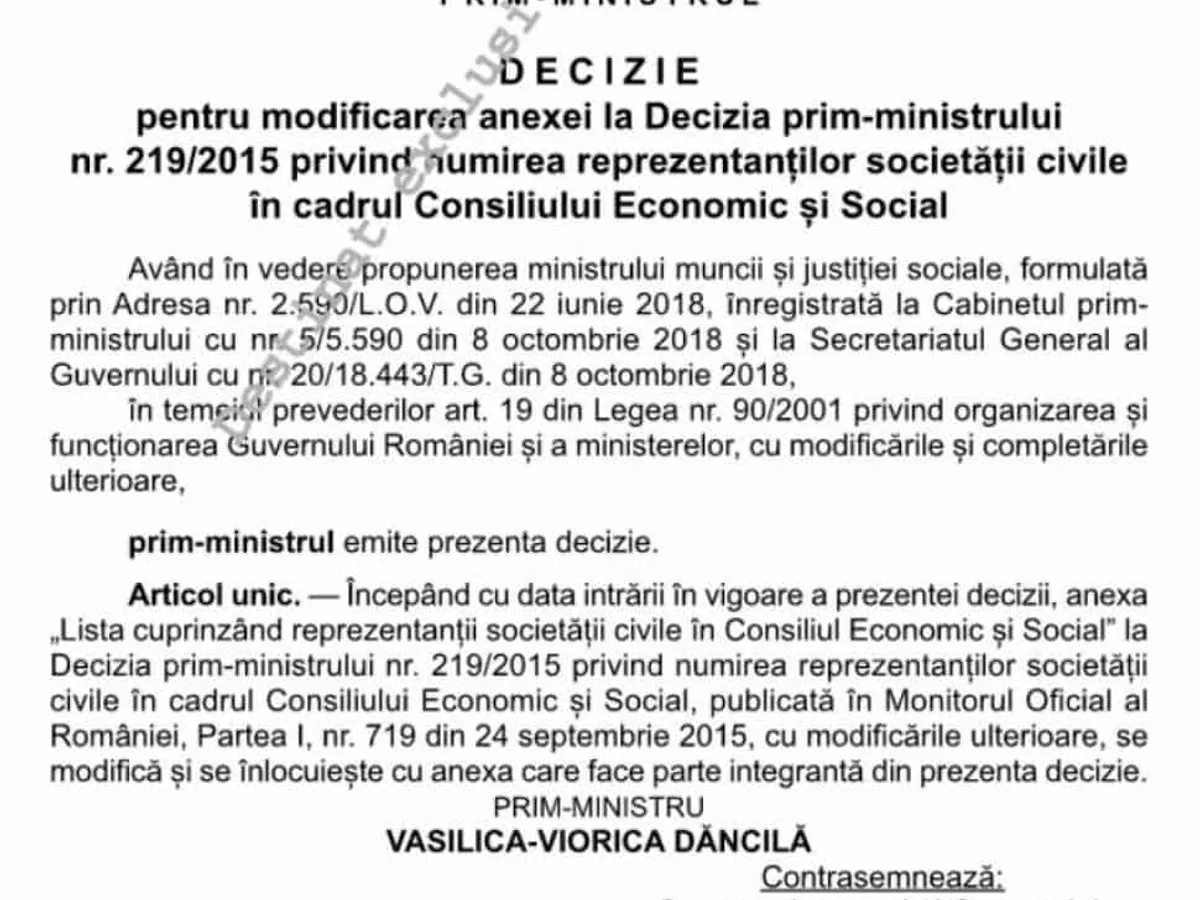 Consiliul Economic și Social are rol esențial în procesul legislativ al guvernului, pentru că analizează și avizează toate proiectele de acte normative inițiate de Executiv. Potrivit Monitorului Oficial, decizia premierului Viorica Dăncilă este întemeiată pe o propunere a ministrului Muncii, Lia Olguța Vasilescu, făcută pe 22 iunie și ajunsă la Guvern abia 4 luni mai târziu, pe 8 octombrie.