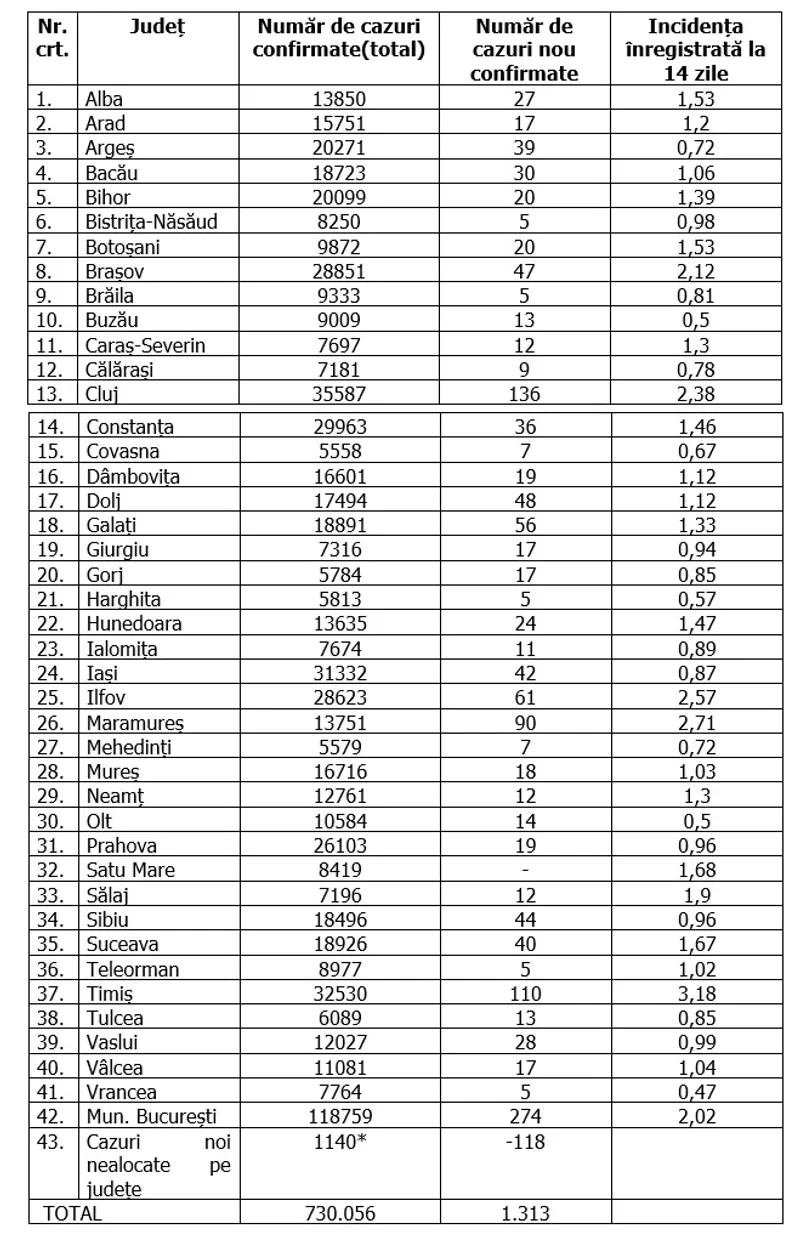 În total, în România au fost confirmate 730.056 de cazuri de infectare cu coronavirus, iar 18.402 persoane infectate au murit.