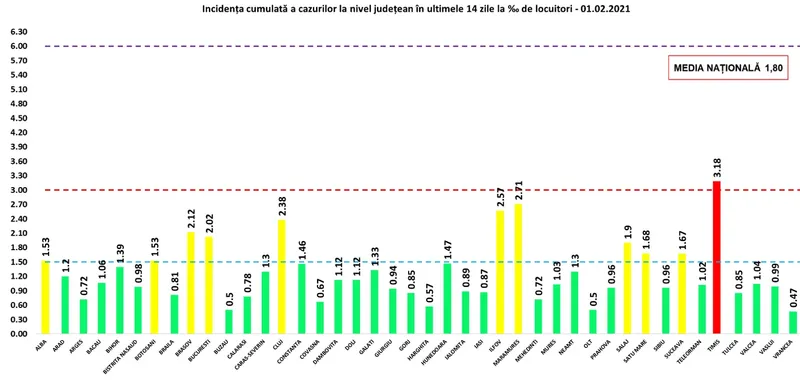 În scenariul galben mai sunt 10 județe, iar Capitala raportează o incidență de 2,02 la mia de locuitori. Singurul județ în scenariul roșu este Timiș, cu o incidență în scădere, de 3,18 la mia de locuitori.
