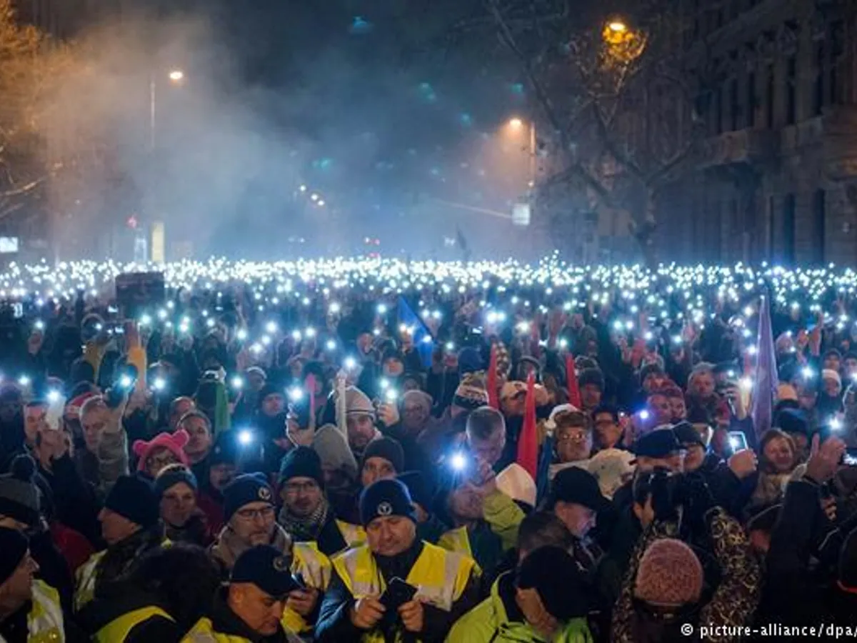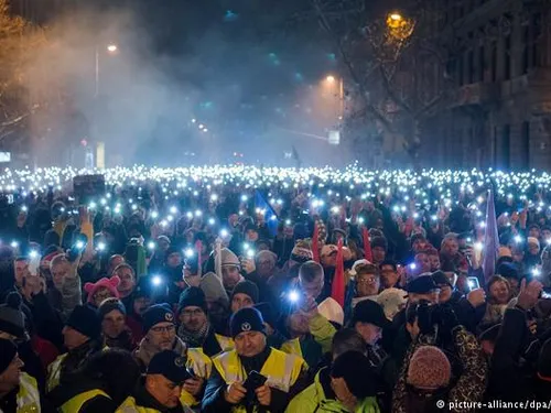 Dacă vezi numai fotografiile, ai putea crede că marea de lumini de la Budapesta este un spectacol de Advent. Dar oamenii, care s-au adunat sâmbătă seara în capitala Ungariei, nu țin în mâini lumânări, ci telefoane mobile, iar mesajul lor nu este unul religios, ci politic. Ei cer premierului Viktor Orban să retragă o lege, prin care angajatorii au dreptul să ceară angajaților să lucreze până la 400 de ore suplimentare pe an. De când s-a votat legea în Parlament, miercurea trecută, tot mai mulți oameni protestează față de așa-zisa ”lege a sclaviei”. Au existat și incidente violente. Duminică, protestele au fost la început pașnice, după care Poliția a recurs din nou la gaze lacrimogene.