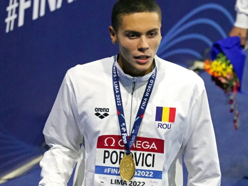 David Popovici e campion mondial și dublul campion european de seniori la înot, în probele de 100 și 200 de metri.