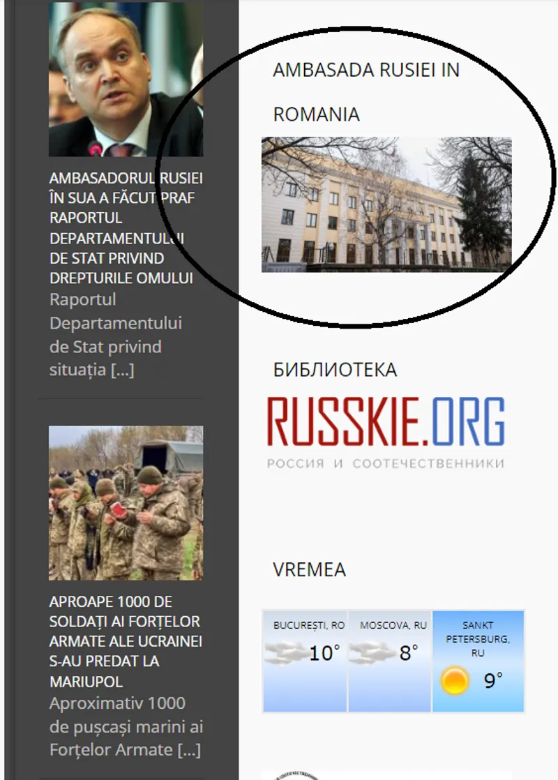 Mai mult, „veștidinrusia.ro” găzduiește un link care trimite direct la site-ul Ambasadei Rusiei în România.