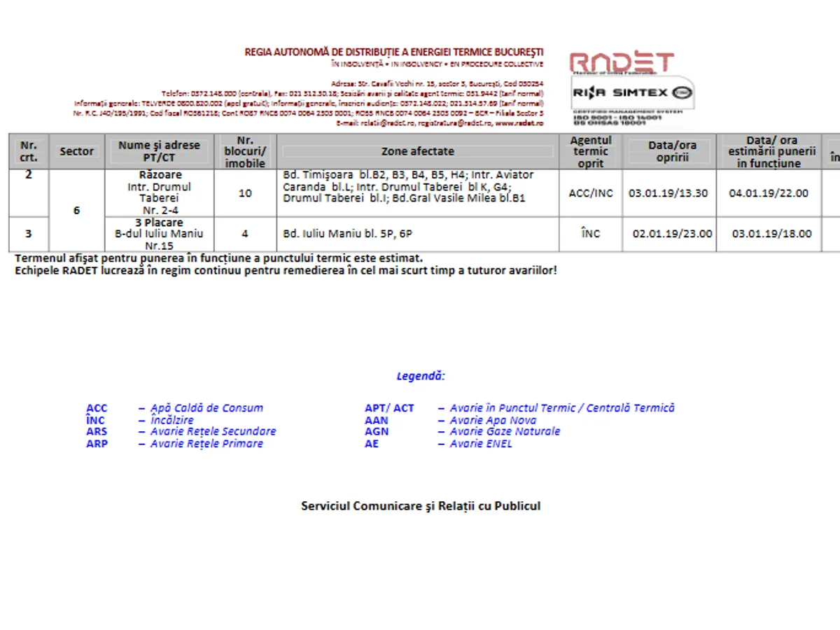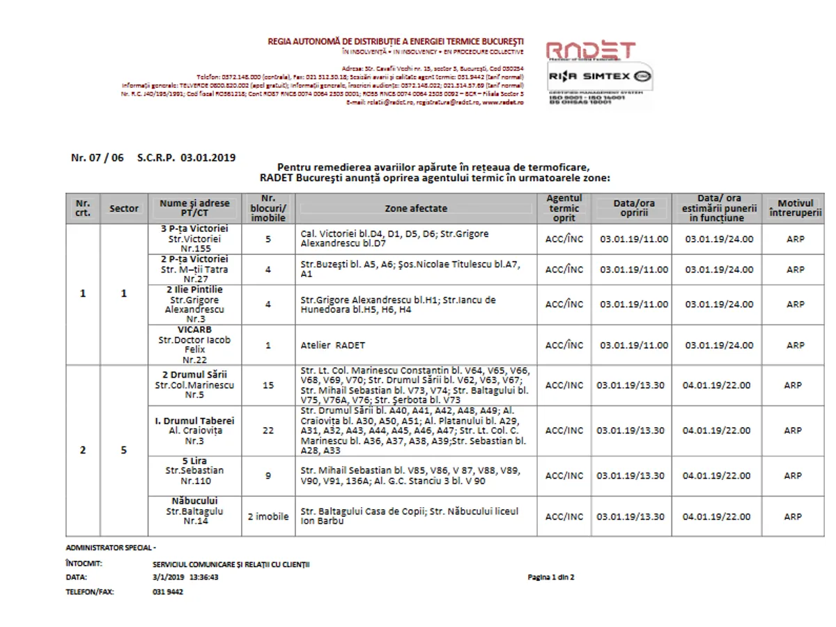 În lista zonelor afectate sunt precizate și intervalele orare în care alimentarea va fi oprită, acestea fiind ”estimative„. Totuși, tot pe site-ul RADET regăsim un anunț în care ni se spune că nu sunt programate lucrări în distribuția energiei termice în data de 3 ianuarie, deși tabelul spune că în multe dintre zonele afectate, alimentarea ar trebui să revină până la miezul nopții.