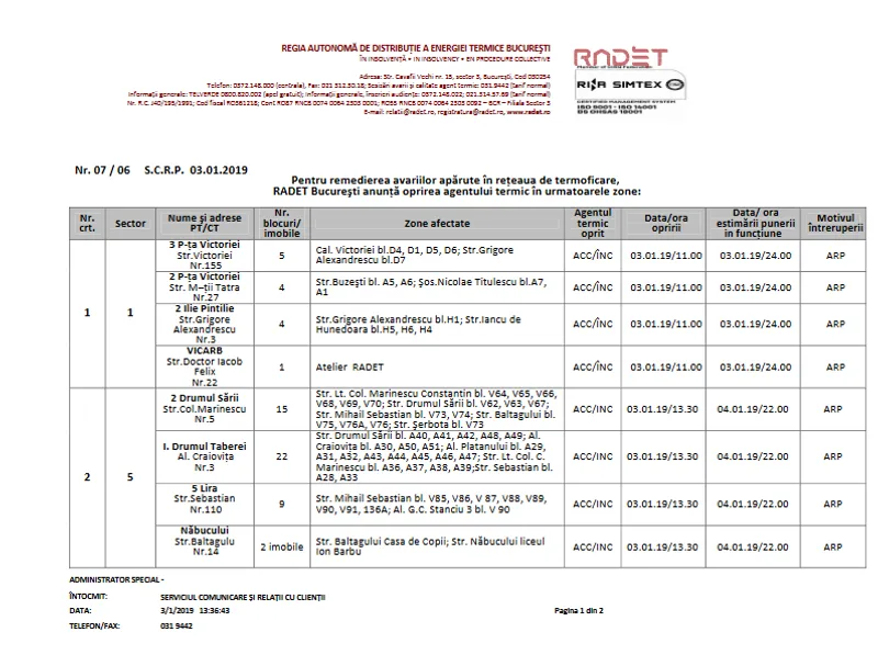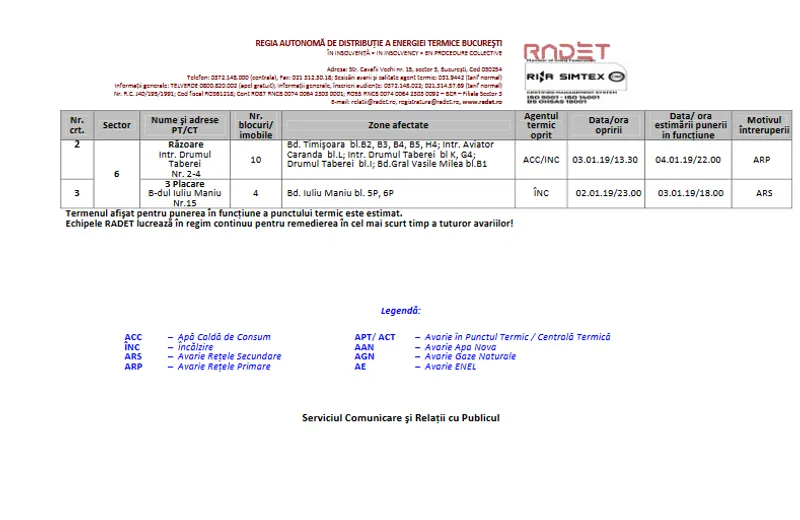 Începutul noului an i-a prins pe locatarii din aproape 80 de imobile din Capitală, fără căldură. Inițial, RADET a anunțat că sistemul funcționează în parametri, dar listele cu avarii arată mai multe zone din sectoarele 1, 5 și 6 ca fiind sistate de la alimentarea cu căldură, din cauza unor avarii la Rețelele Primare.