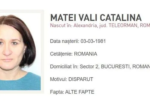 Persoana dispărută se numeşte Matei Vali Cătălina şi este în vârstă de 43 de ani", anunţa Biroul de presă al DGPMB.