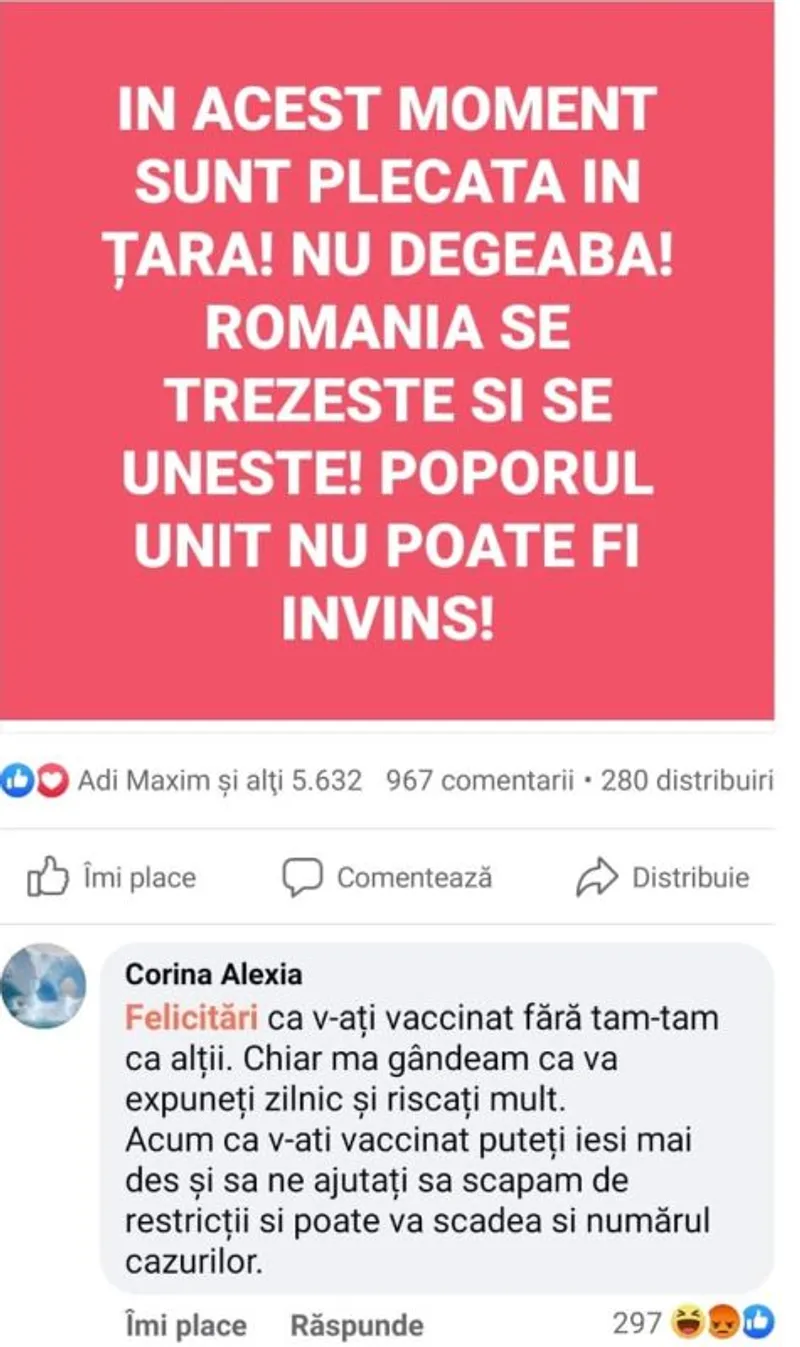 „Felicitări ca v-ați vaccinat fără tam-tam ca alții. Chiar ma gândeam ca va expuneți zilnic și riscați mult.
