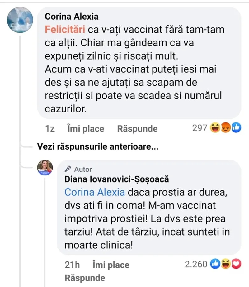 Diana Șoșoacă a avut o reacție violentă la această afirmație. A fost urmată de fanii săi, care au sărit în apărarea parlamentarei. Pestte 300 de comentarii în care cei care cred în senatoare au negat că aceasta s-ar fi vaccinat.