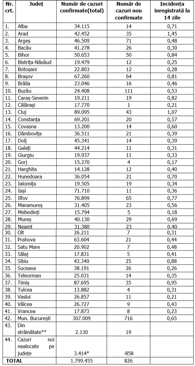 Distribuția pe județe a cazurilor per total și a celor noi o regăsiți în tabelul de mai jos: