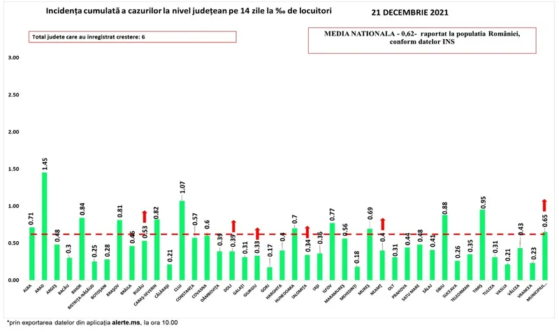 Coeficientul infectărilor cumulate la 14 zile, raportate la 1.000 de locuitori este calculat de către Direcțiile de Sănătate Publică, la nivelul Municipiului București și al județelor. Mai jos aveți graficul realizat în baza raportărilor primite de CNCCI de la Direcțiile de Sănătate Publică: