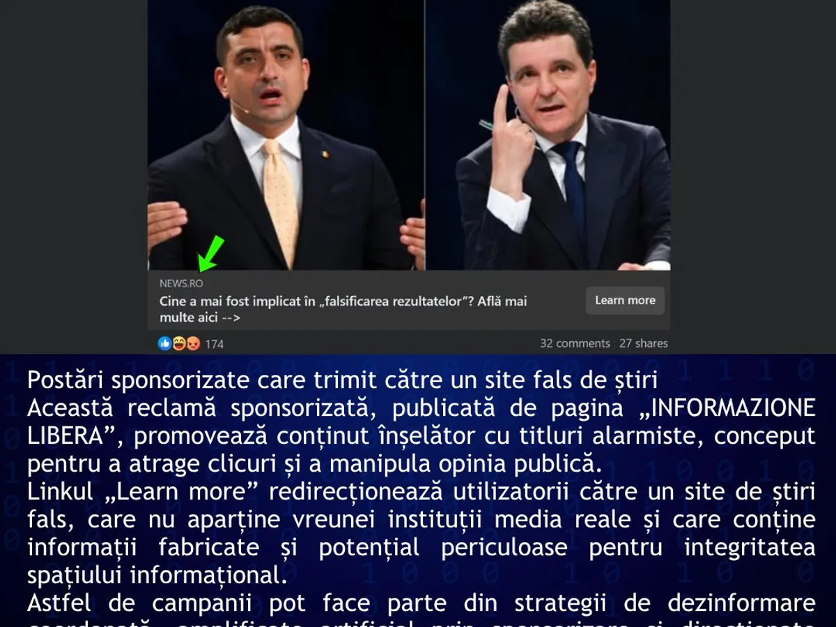 Potrivit sursei citate, anunțurile sponsorizate lansate de către atacatori, dintre care trei vizează utilizatori din România, au ca țintă principală redirecționarea utilizatorilor către un site care conține informații false despre alegerile din România și, totodată, promite 'câștiguri miraculoase' prin investiții riscante și frauduloase.