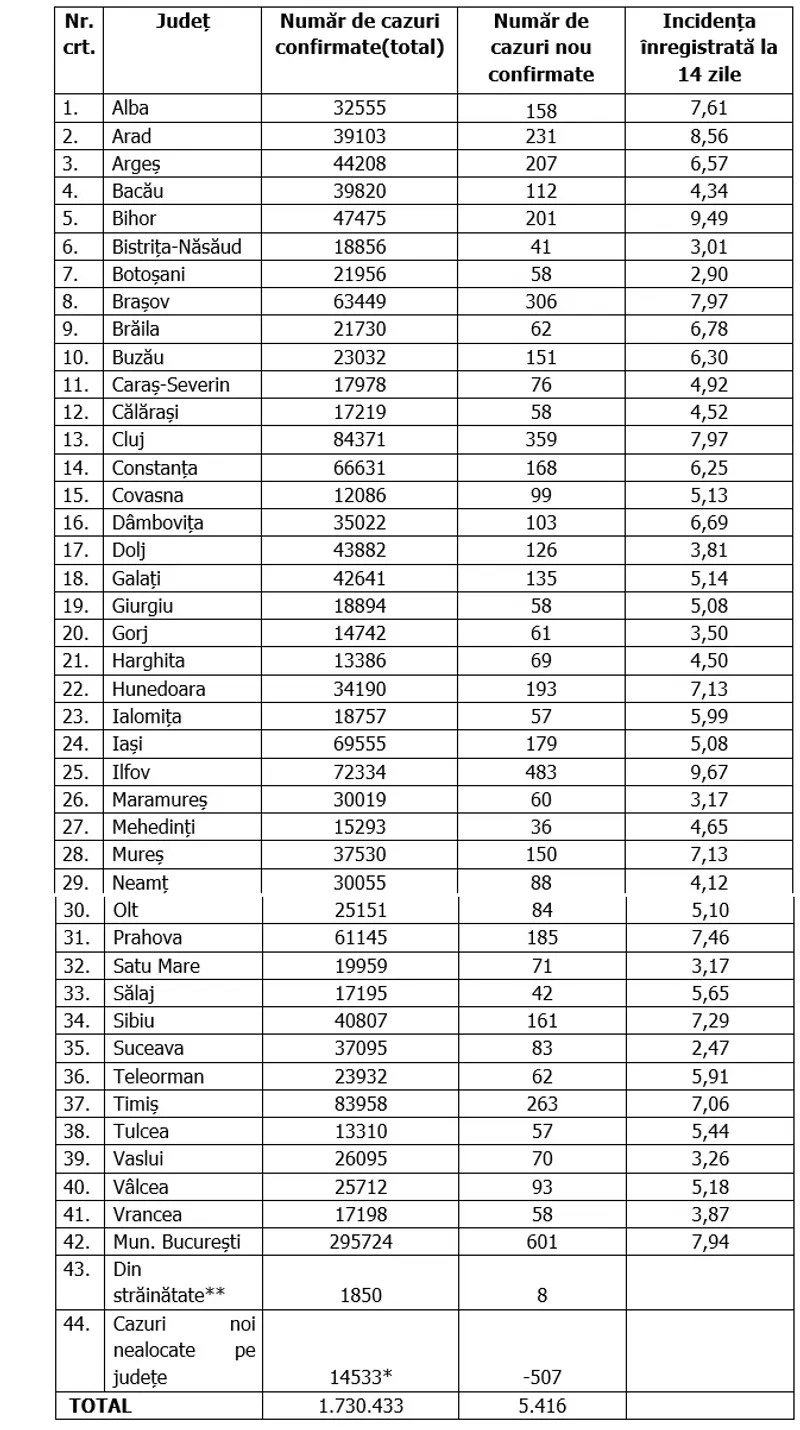 În total, în România au fost raportate, până în prezent, 1.730.433 de cazuri de infectare cu coronavirus, dintre care 9.508 sunt ale unor pacienți reinfectați, testați pozitiv la o perioadă mai mare de 180 de zile după prima infectare.