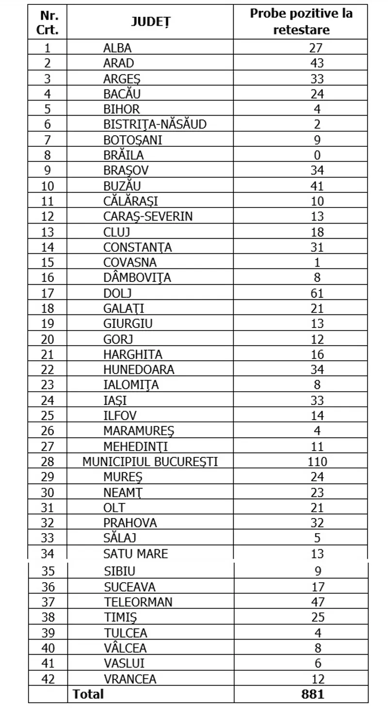 Distinct de cazurile nou confirmate, în urma retestării pacienților care erau deja pozitivi, 881 de persoane au fost reconfirmate pozitiv. Distribuția pe județe a acestor cazuri o regăsiți în tabelul de mai jos: