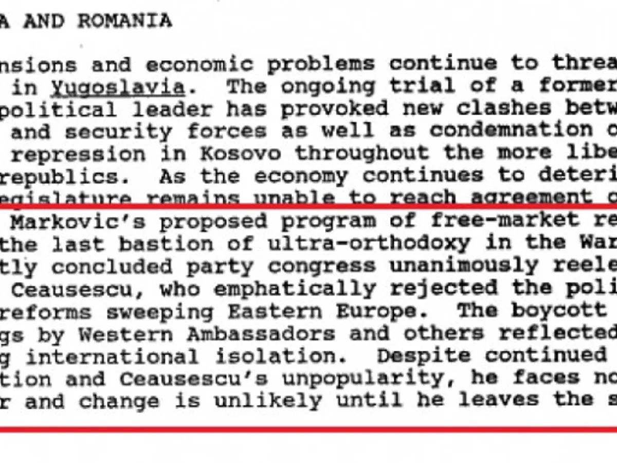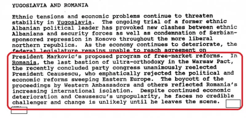 „În România, ultimul bastion al ultra-ortodoxiei din Pactul de la Varșovia, recent încheiatul congres al partidului (Partidul Comunist Român – n.t.) l-a reales în unanimitate pe Președintele Ceaușescu, care a respins emfatic reformele politice și economice care străbat Europa. Boicotul ambasadorilor occidentali și al altora reflectă izolarea internațională tot mai mare a României. În ciuda deteriorării continue a situației economice și popularității în scădere a lui Ceaușescu, nu există niciun rival convingător, iar o schimbare este puțin probabilă până când va părăsi scena”.