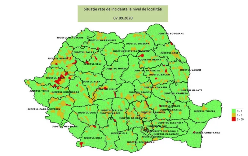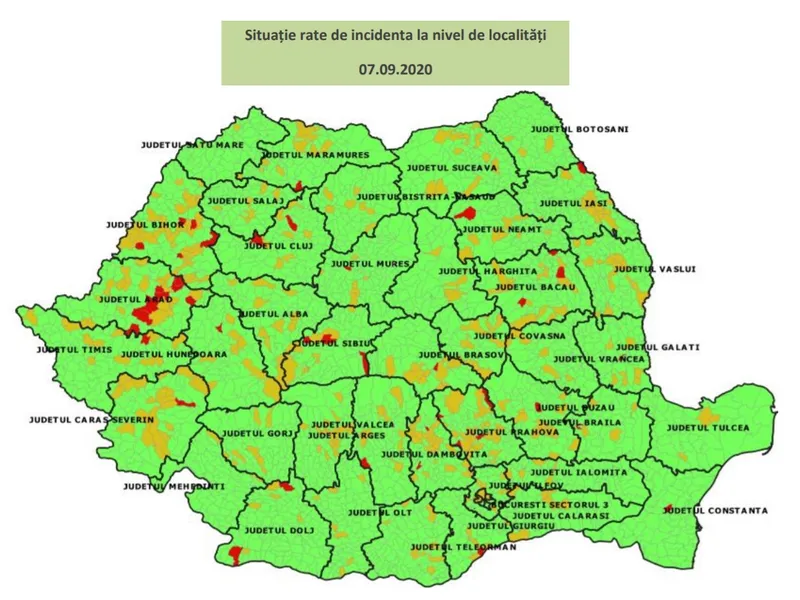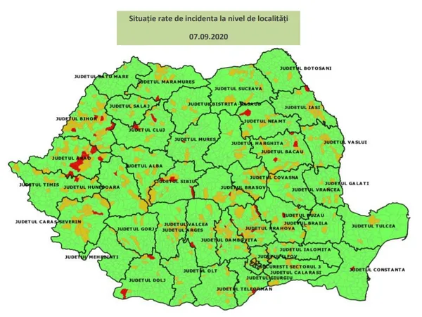 Potrivit acestei hărți, în toate județele poate începe școala fizic, dar sunt localități roșii în județele Arad, Alba, Bacău, Bihor, Buzău, Caraș, Cluj, Constanța, Dâmbovița, Dolj, Iași, Neamț, Maramureș, Prahova, Teleorman, unde școala poate începe doar online. În total, este vorba despre 43 de localități.