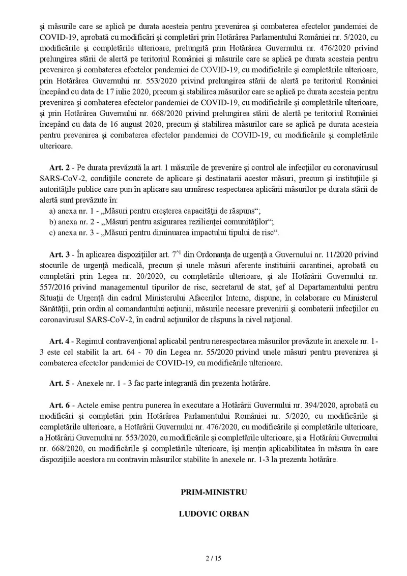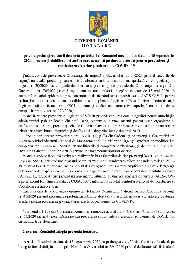„Începând cu data de 15 septembrie 2020 se prelungeşte cu 30 de zile starea de alertă pe