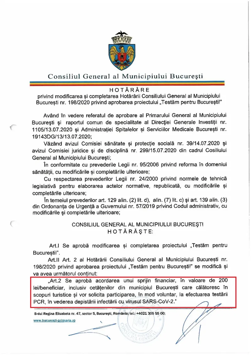 Totodată, Primăria Capitalei va da încă 200 de lei fiecărui beneficiar „inclusiv cetățenilor din municipiul București care călătoresc în scopuri turistice și vor solicita participarea, în mopd voluntar, la efectuarea testării PCR, în vederea depistării infectării cu virusul SARS-CoV-2”, conform Hotărârii Consiliului General al Municipiului București care completează proiectul „Testăm pentru București”.