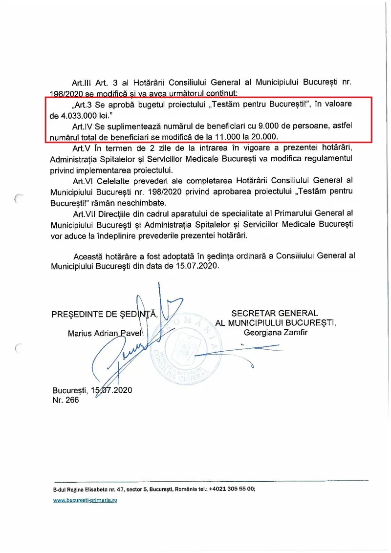 Conform documentului citat, suma totală a proiectului completat este de 4.033.000 de lei. Potrivit unui răspuns anterior al PMB pentru Newsweek România, suma inițială alocată proiectului „Testăm pentru București” era de 2,23 milioane de lei, ceea ce înseamnă că doar testarea bucureștenilor care merg în vacanță se ridică la circa 1,8 milioane de lei.