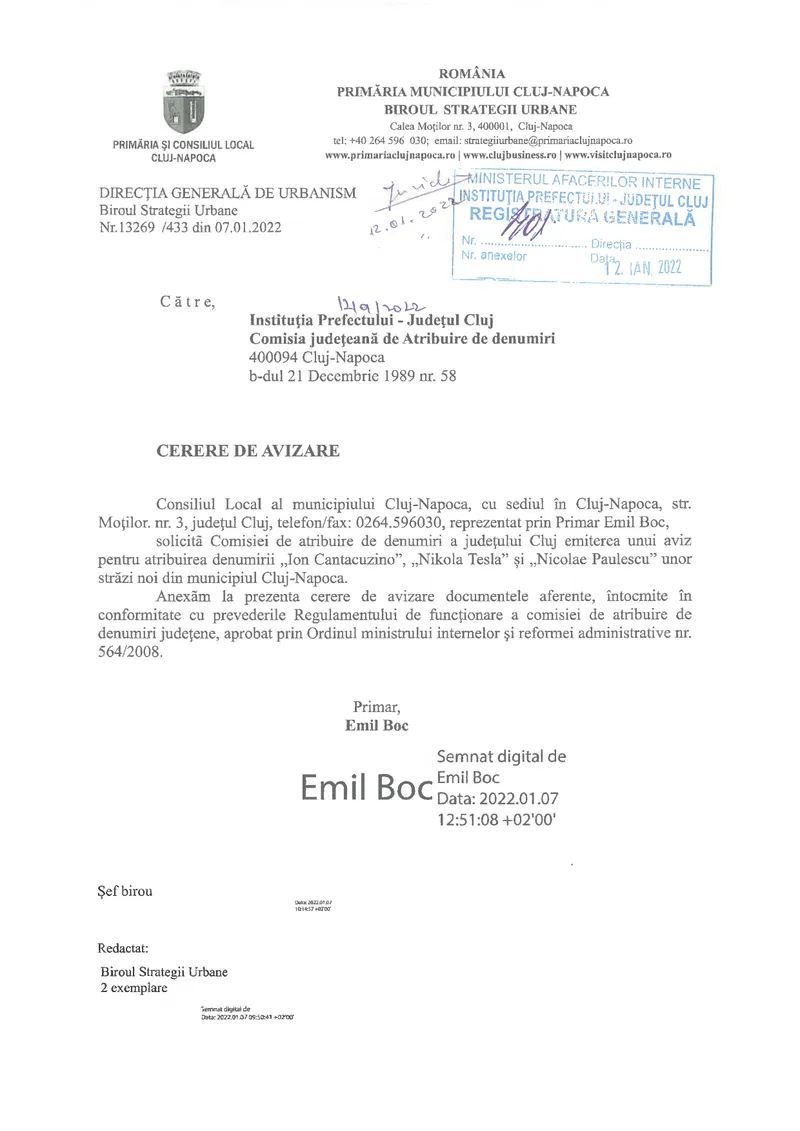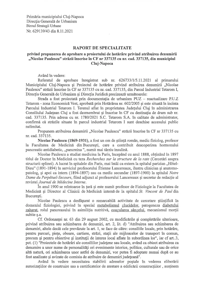 Cererea de avizare trimisă Prefecturii Cluj este semnată de primarul Emil Boc, iar în referatul de aprobare este menționat că edilul vrea să atribuie numele lui Nicolae Paulescu unei străzi situate în incinta Parcului Industrial Tetarom S.A.