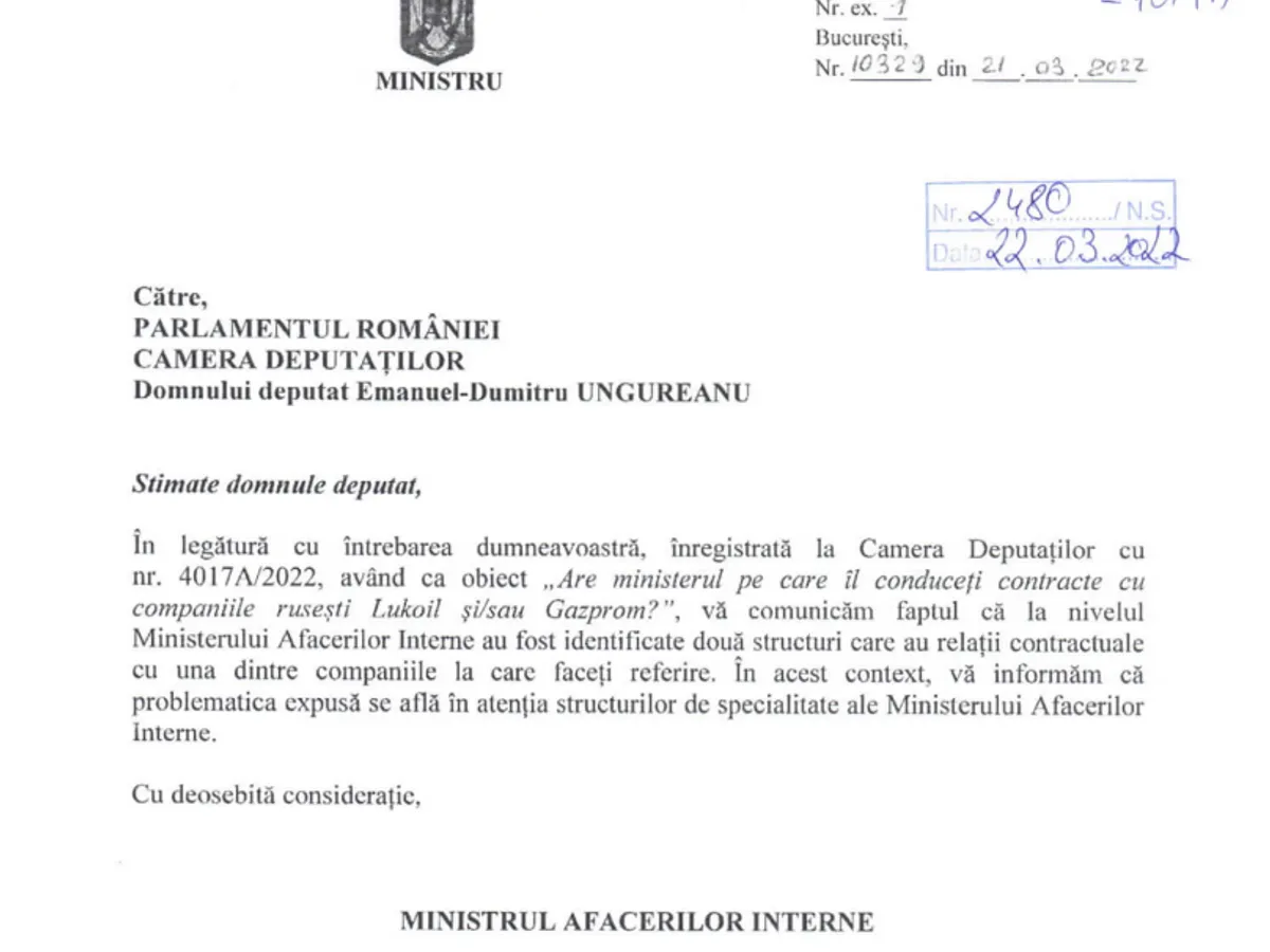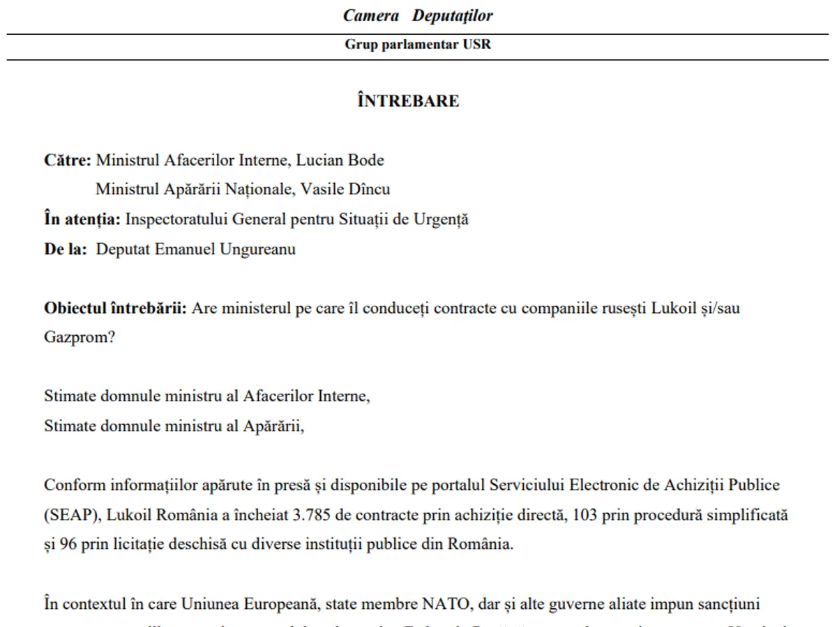 Totul a ieșit la iveală după ce deputatul USR Emanuel-Dumitru Ungureanu i-a întrebat pe miniștrul Apărării și pe cel al Afacerilor Interne dacă „ministerul pe care îl conduceți, ori instituțiile din subordine, au vreun contract încheiat cu compania Lukoil și/sau cu compania Gazprom pentru alimentarea mașinilor din dotare și dacă plănuiți să reziliați aceste contracte”.