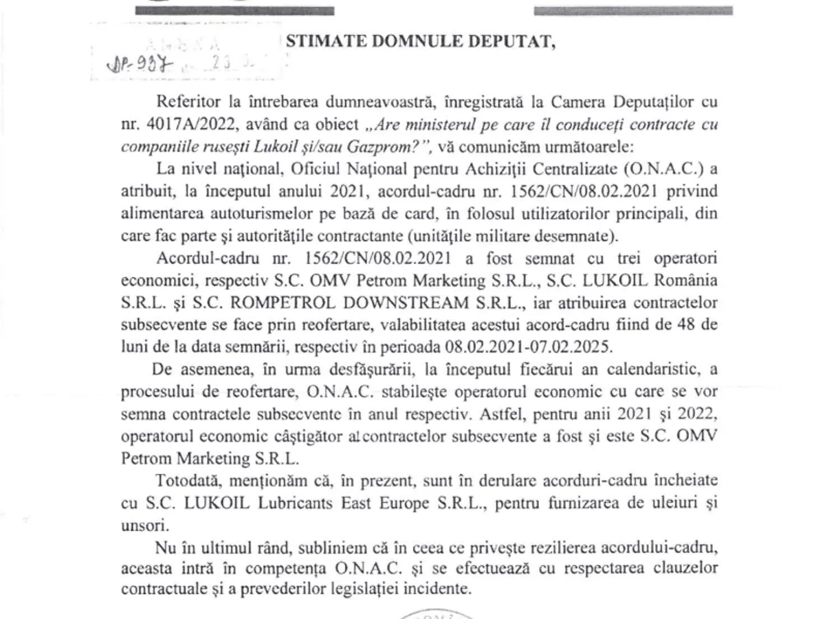Ministrul Apărării precizează că în urma desfășurării, la începutul fiecărui an calendaristic, a procesului de reofertare, ONAC stabilește operatorul economic cu care se vor semna contractele subsecvente în anul respectiv. „Pentru anii 2021 și 2022, operatorul economic câștigător al contractelor subsecvente a fost OMV- Petrom”, a spus el. Asta nu înseamnă că în anii următori Lukoil poate încheia un contract subsecvent de furnizare de combustibil pentru autovehiculele structurilor din suboerdinea MApN.
