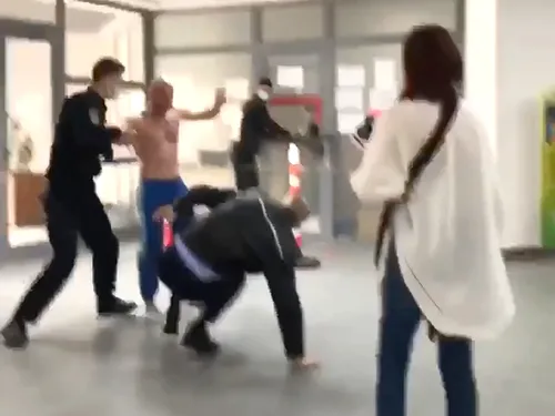 Forțelor de ordine care au încercat să intervină nu le-a fost ușor, mai ales unuia dintre polițiști, care a alunecat pe gresie și a căzut în încercarea de a-l imobiliza pe unul dintre agresori.