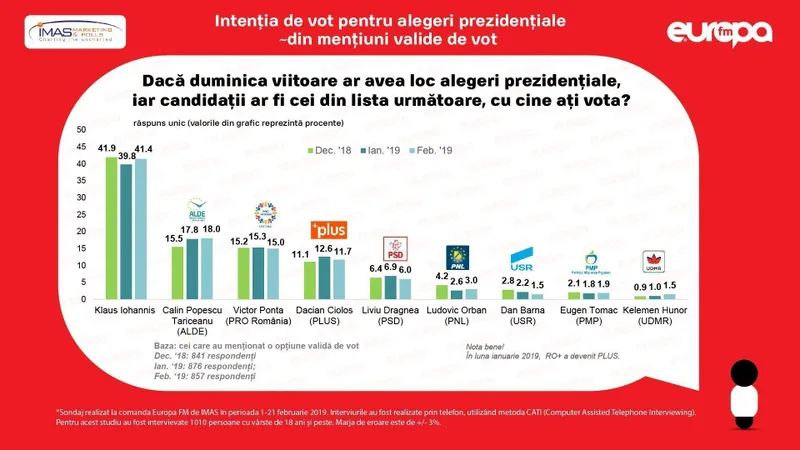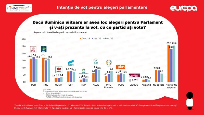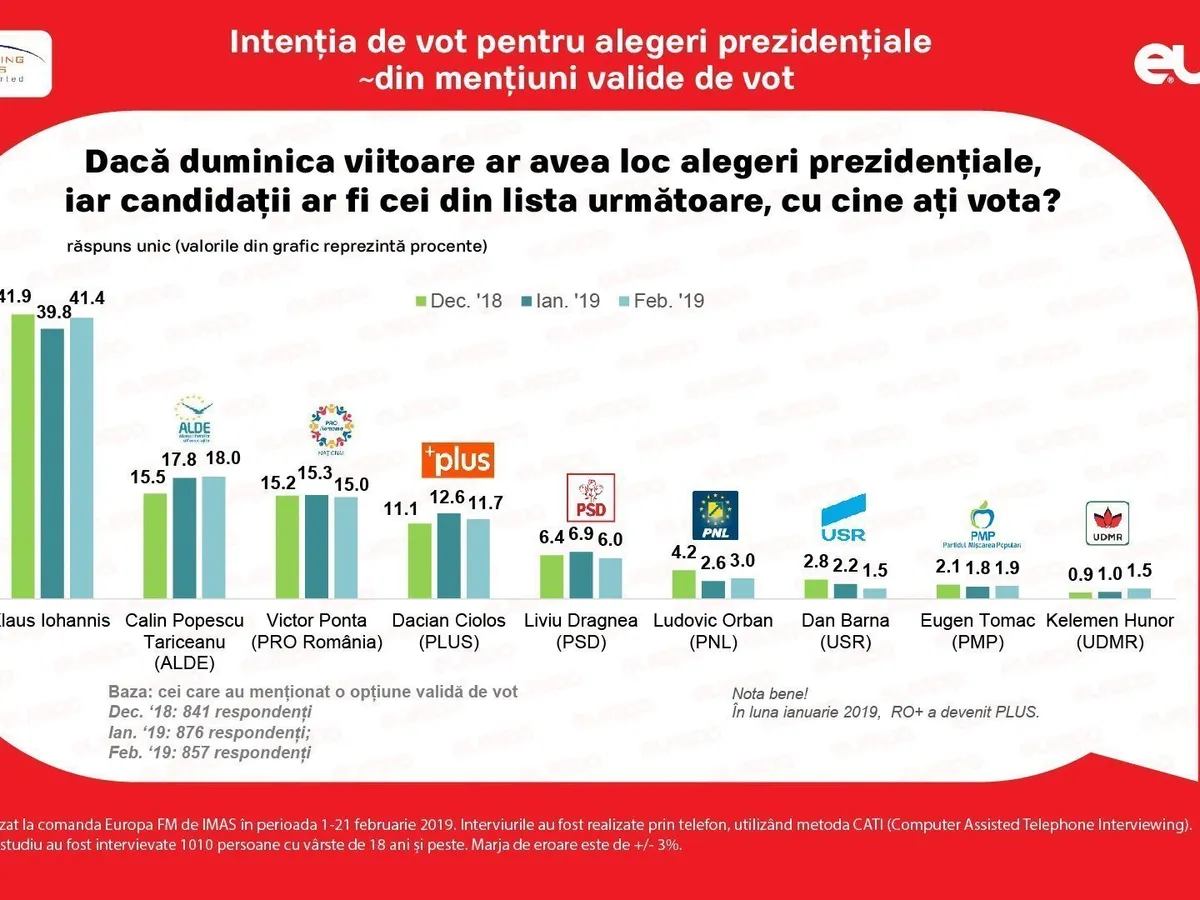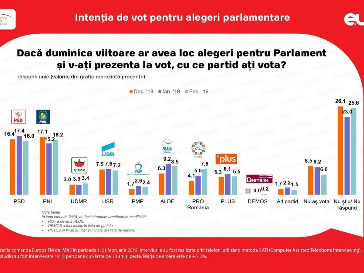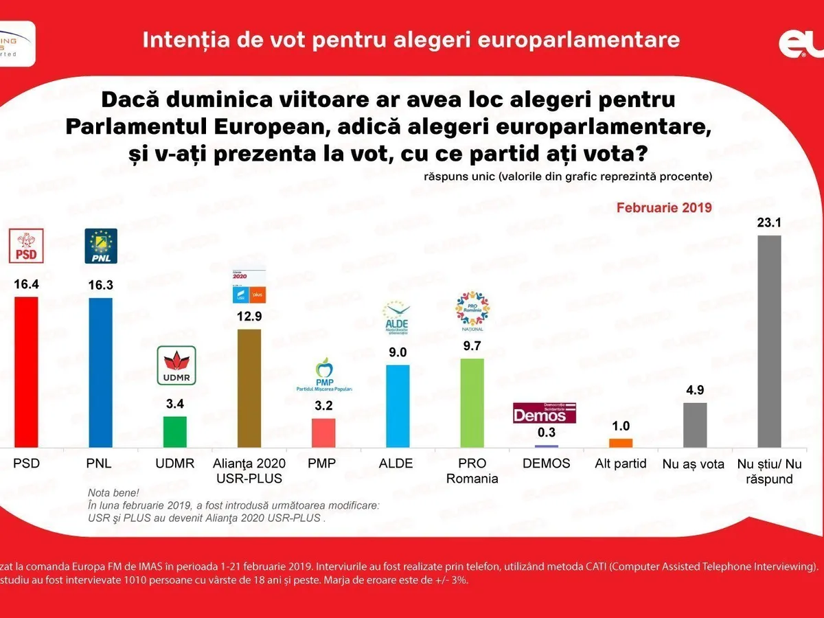 La comanda Europa FM, IMAS a realizat un nou sondaj care urmărește intențiile de vot ale românilor pentru alegerile europarlamentare, alegerile parlamentare și alegerile prezidențiale.