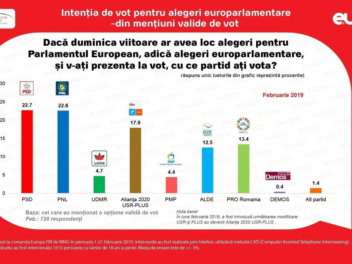 ”Dacă duminica viitoare ar avea loc alegeri pentru Parlament European, adică alegeri europarlamentare, și v-ați prezenta la vot, cu ce partid ați vota?”. Luând în calcul doar opțiunile valide, adică ale respondenților care și-au manifestat și intenția de a merge la vot, rezultatele arată așa: PSD – 22,7 %, PNL – 22,6%, UDMR – 3,4%, Alianța USR- PLUS – 12,9 %, ALDE – 9%, Pro România – 9,7%, PMP – 3,2%.