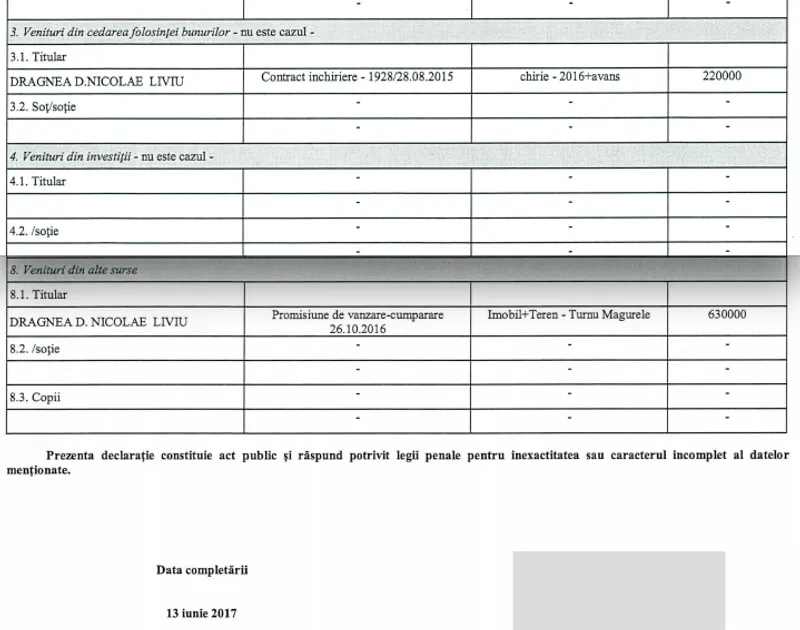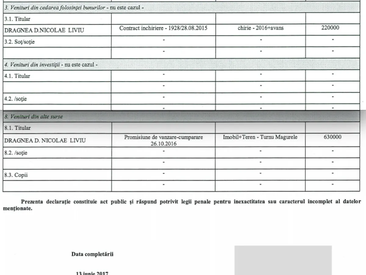 Astfel, în 2017, Dragnea a încasat, dintr-un foc, 850.000 de lei din chirii și promisiuni de vânzare-cumpărare.