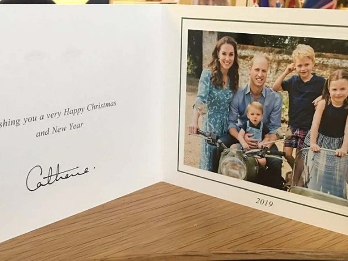 Pentru Crăciunul de anul acesta, ducii de Cambridge au ales o fotografie realizată în vară, în care apar alături de copiii lor, Louis, George şi Charlotte alături de o motocicletă cu ataş.