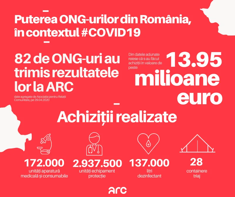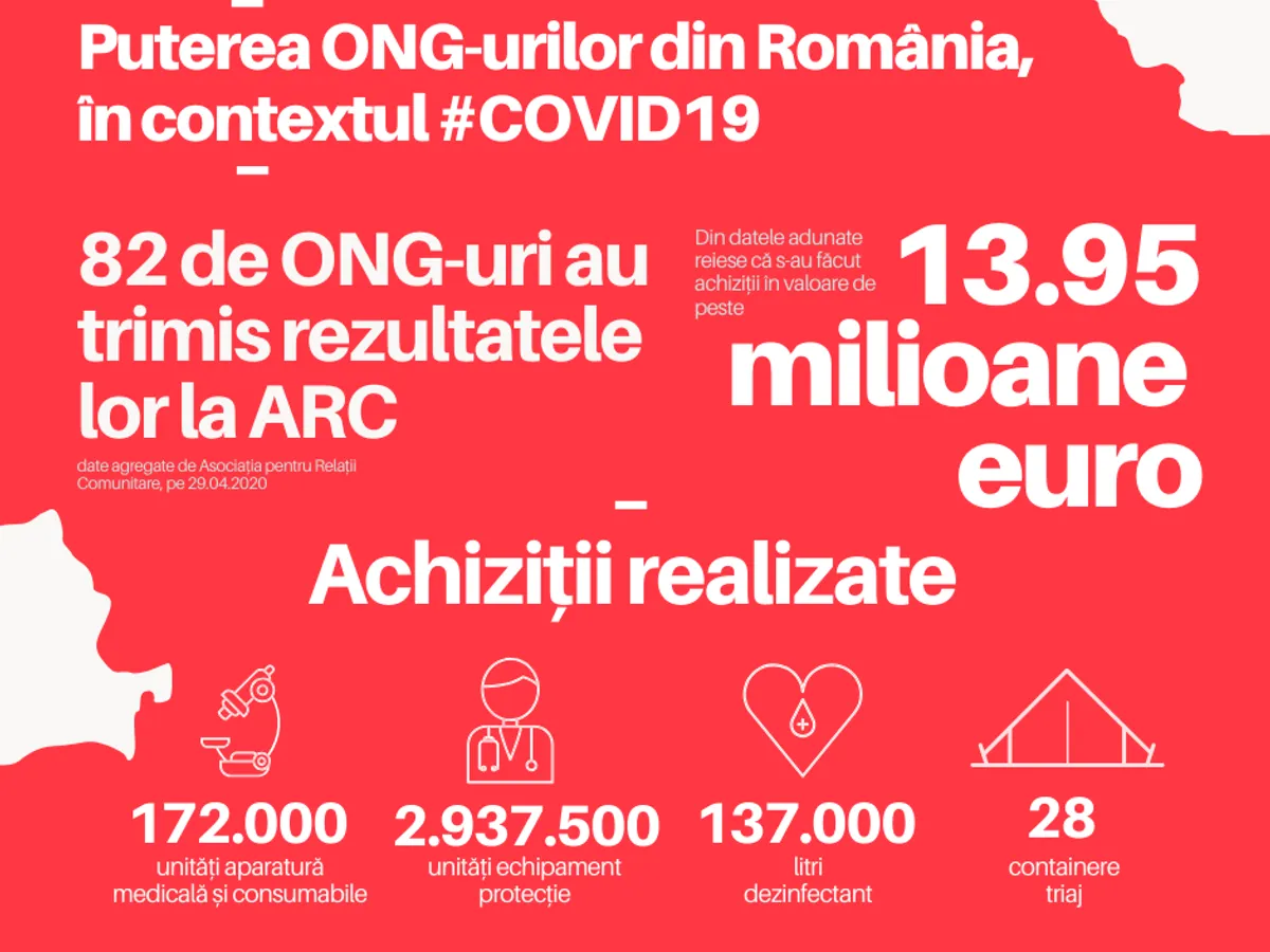 „Cele peste 80 organizații care au răspuns chestionarului realizat de Asociația pentru Relații Comunitare au reușit, în șapte săptămâni, să cumpere echipamente și aparatură medicală în valoare de peste 13,95 milioane euro. Suma provine din calculul făcut de Asociația pentru Relații Comunitare și are la bază datele comunicate de respectivele organizații.
