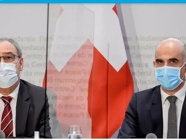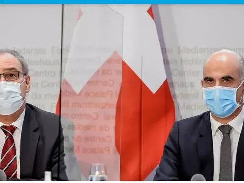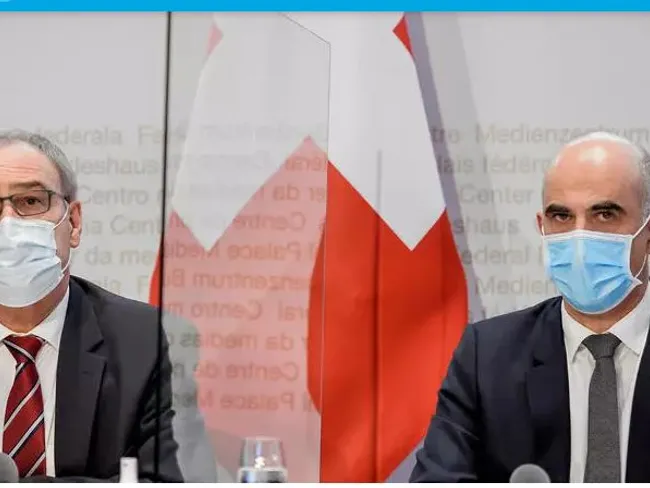 Președintele elvețian Guy Parmelin și ministrul Sănătății, Alain Berset, au explicat măsurile la o conferință de presă în care, pentru prima dată, au fost separați de ecrane de plastic și au purtat măști pe tot parcursul conferinței.