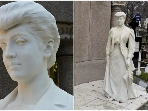 Trecătorii sunt uimiți de opera de artă ce tronează în cimitir. Dar, care este povestea „Doamnei cu umbrelă”?