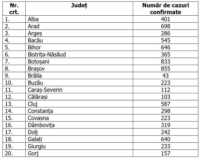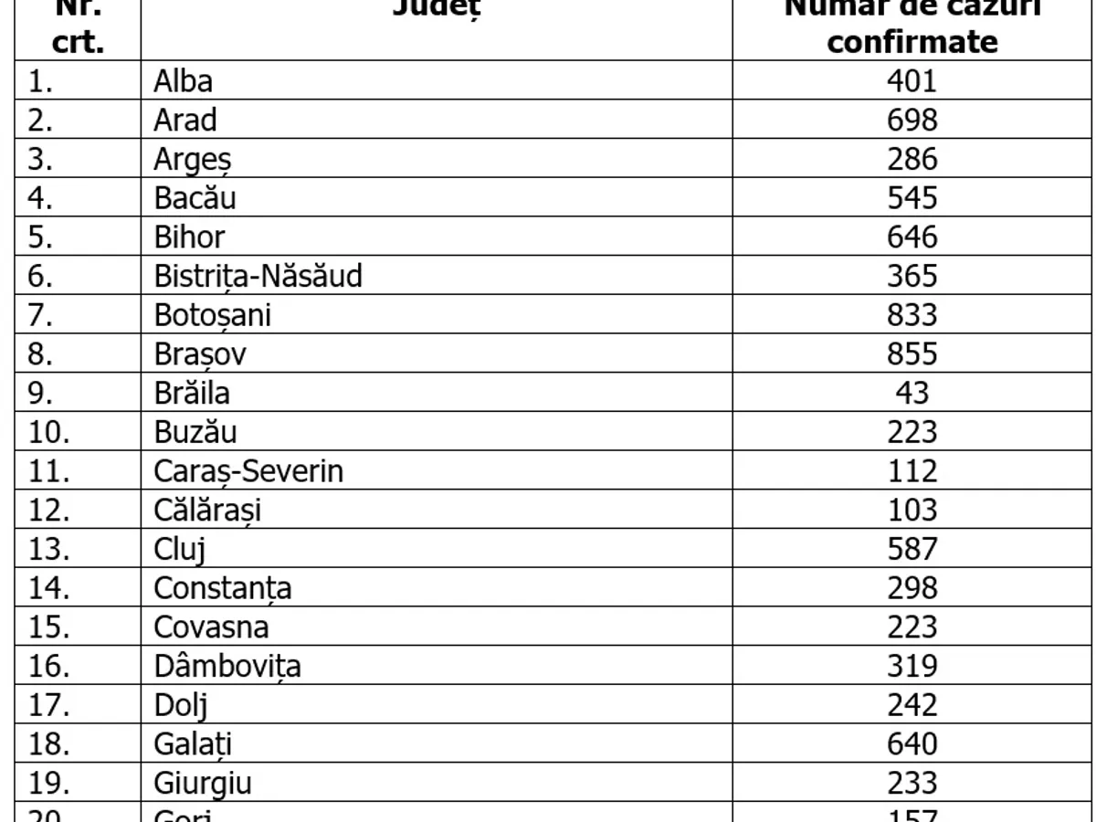 Numărul cazurilor noi confirmate în ultimele 24 de ore a scăzut la 125, după o creștere de câteva zile, anunță Grupul de Comunicare Strategică (GSC). În total, sunt 20.604 de cazuri confirmate în România.
