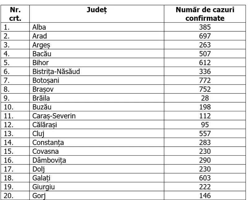 Numărul de cazuri confirmate, pe județe, potrivit raportării Institutului Național de Sănătate Publică: